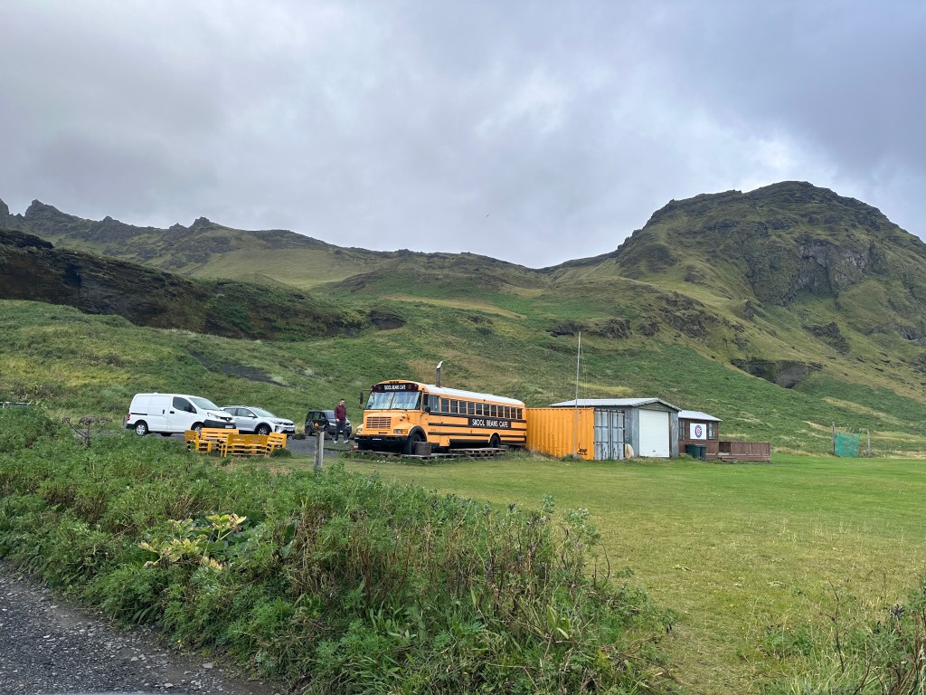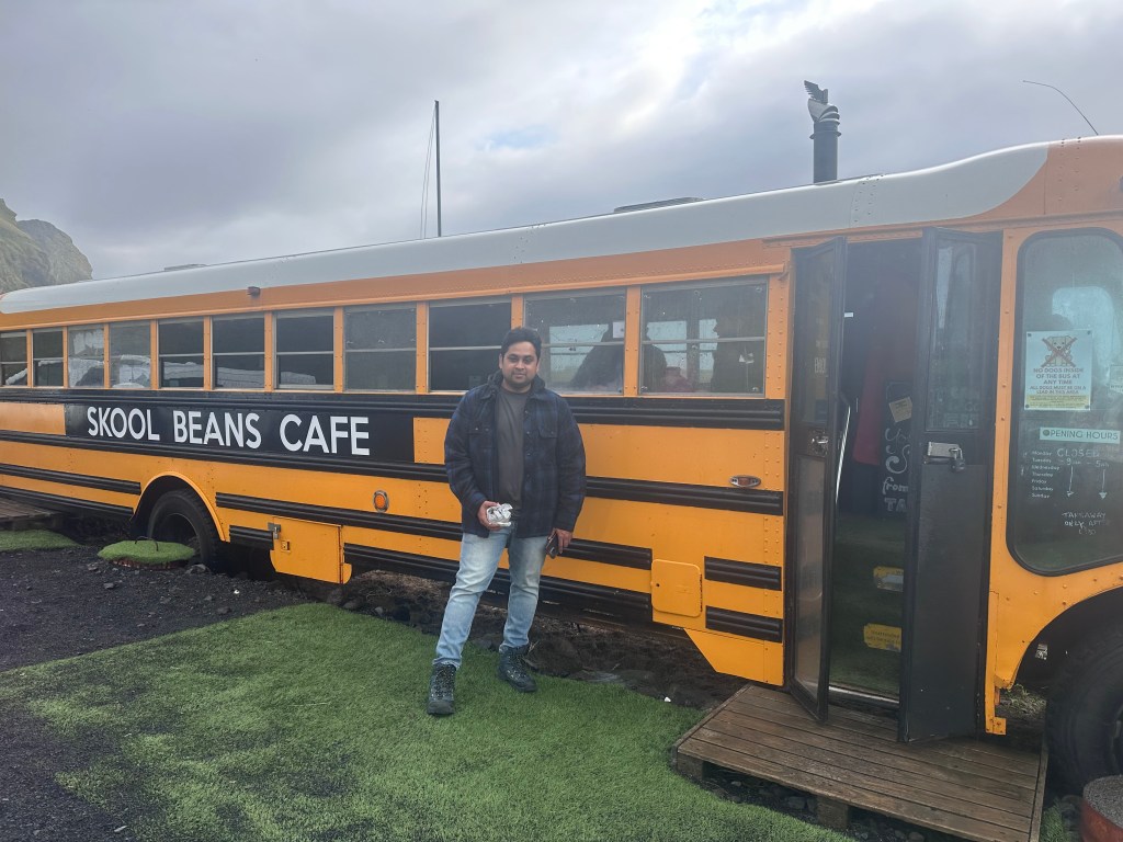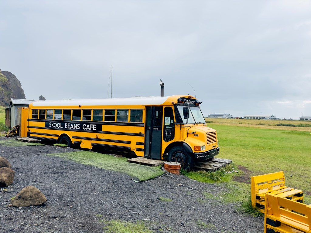 the heart of Vík, you’ll find Skool Beans — Iceland’s first micro roaster and tea lab set inside a retro school bus. This quirky little spot is a true hidden gem, serving up expertly crafted coffee, specialty teas, and indulgent hot chocolates. Step aboard, and you’re welcomed by rustic interiors that perfectly reflect the character of the surrounding landscape, while also celebrating the bus’s vintage charm.