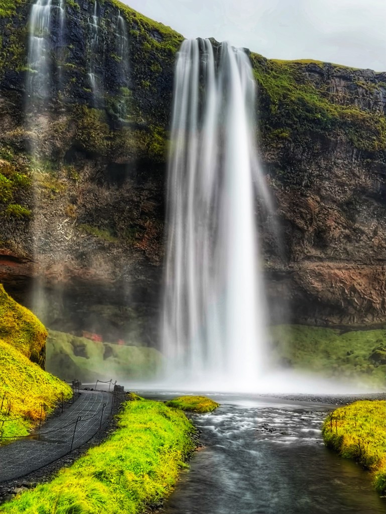 Seljalandsfoss is another unique waterfall in Iceland that you can walk behind. A path and a very short walk takes you behind the fall where you can experience the sound and raw power of nature but do plan to bring a raincoat as you will get soaking wet from the drizzle. It is more impressive than Kvernufoss but it is also more crowded. It’s one of the Best-known Waterfalls in Iceland which is 60m tall and it is breathtakingly Beautiful.